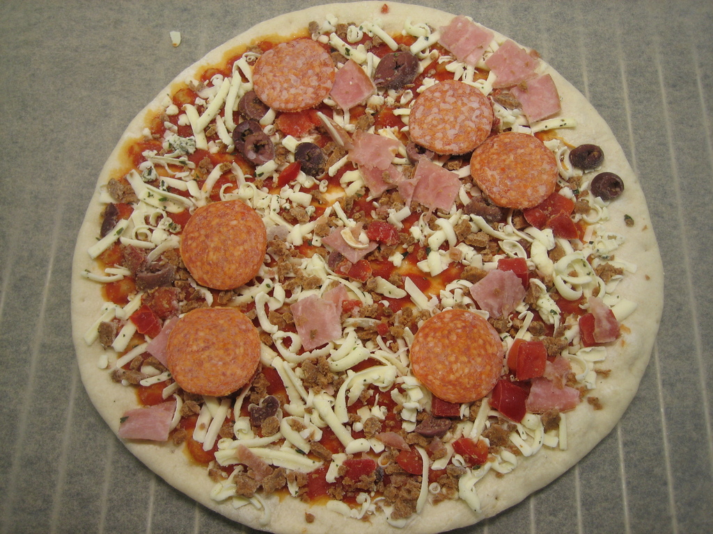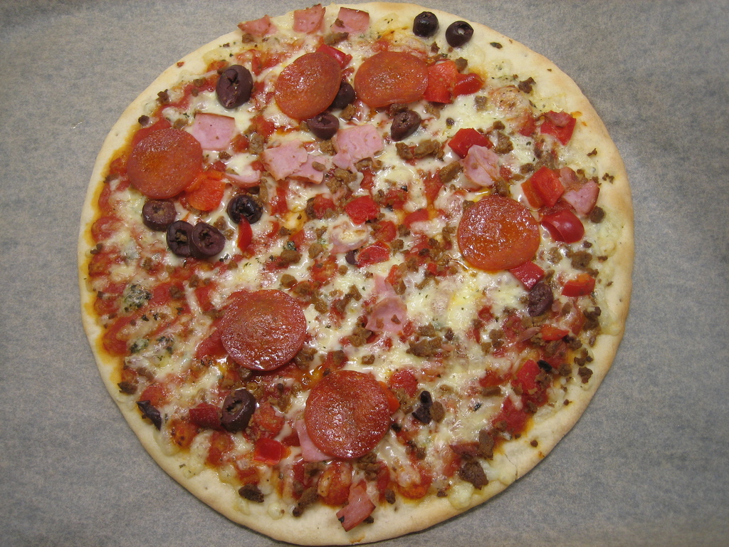 Pohja: suomalainen VEHNÄjauho, vesi, suomalainen rypsi- ja rapsiöljy vaihtelevina osuuksina, suomalainen hiiva, suola, jauhonparanne (askorbiinihappo). Täyte: suomalainen JUUSTO 13 %, tomaattisose, vesi, jauhelihavalmiste 4 % (suomalainen naudanliha, vesi, jodioitu suola, maltodekstriini, kasvikuitu), savukinkku 4 % (suomalainen porsaan kinkku, vesi, suola, stabilointiaineet (E450, E451, E407)), pepperoni 3 % (porsaanliha (EU), silava (EU), suola, säilöntäaine (E250), dekstroosi, glukoosisiirappi, valkosipuli, mausteet, hapettumisenestoaine (E301, E392), mausteuutteet, hapate, pyökkisavu), kalamataoliivi, paprika, sokeri, suola, oregano, auringonkukkaöljy. Saattaa sisältää pieniä määriä soijaa. Valmistettu linjalla, jossa käsitellään myös muita viljoja.